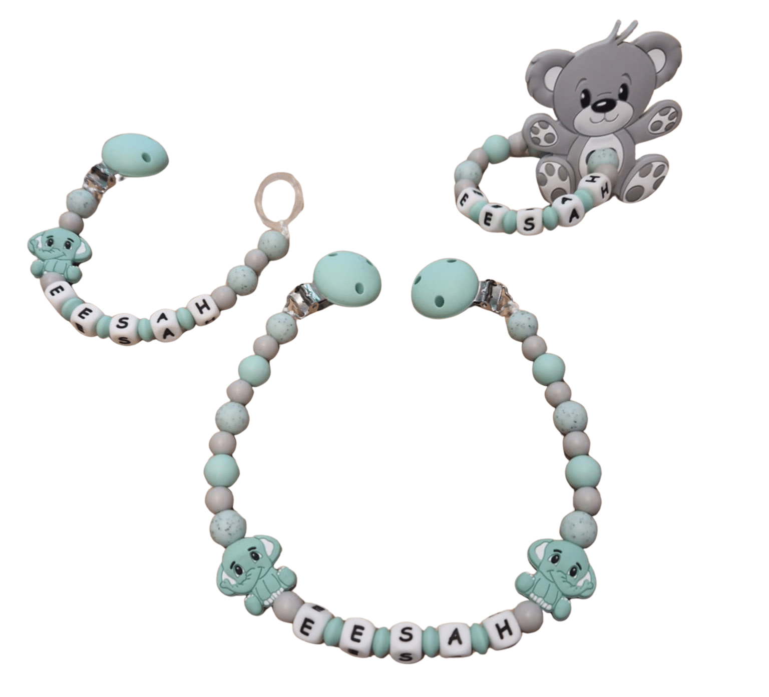 Stilig gavesett bestående av matchende smokkelenke, vognlenke og bitering